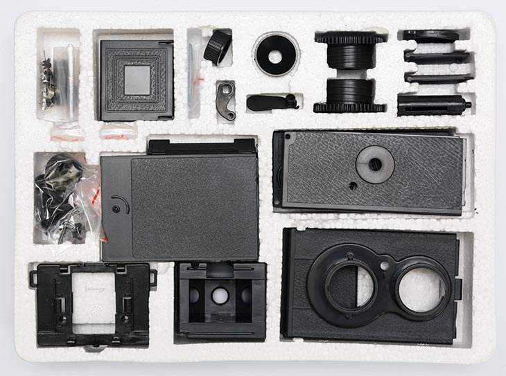 Ich nutzte zum Aufhellen einfach einen solchen KlappreflektorWerbung. Genau für so etwas sind diese Dinger ideal und gut positionierbar. Man kann bei diesen kleinen Objekten aber auch einfach einen weißen Karton nutzen. Ohne frontal eingesetzten Reflektor wäre die Frontansicht der Kamera viel zu dunkel geraten und ohne Detailzeichnung – Da ja das Licht von oben kam.